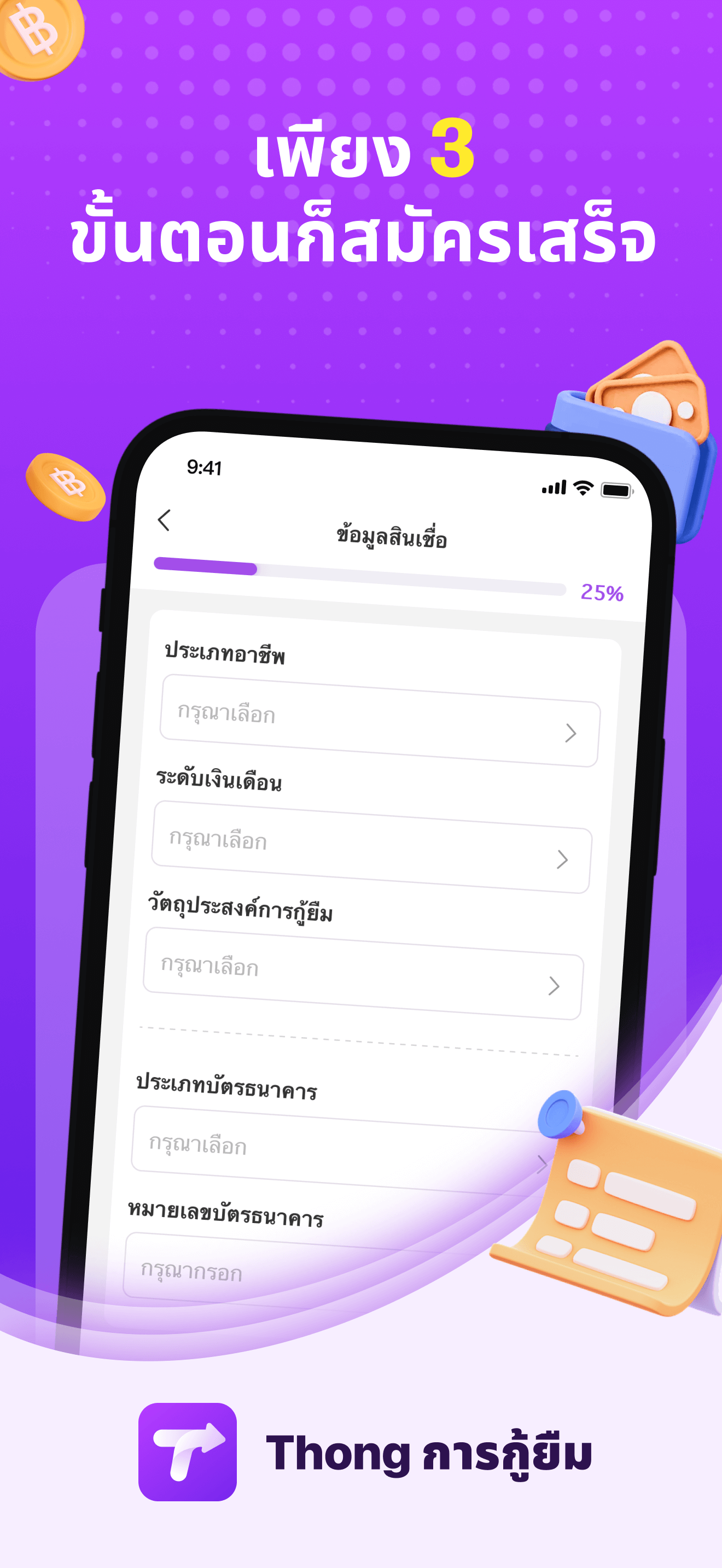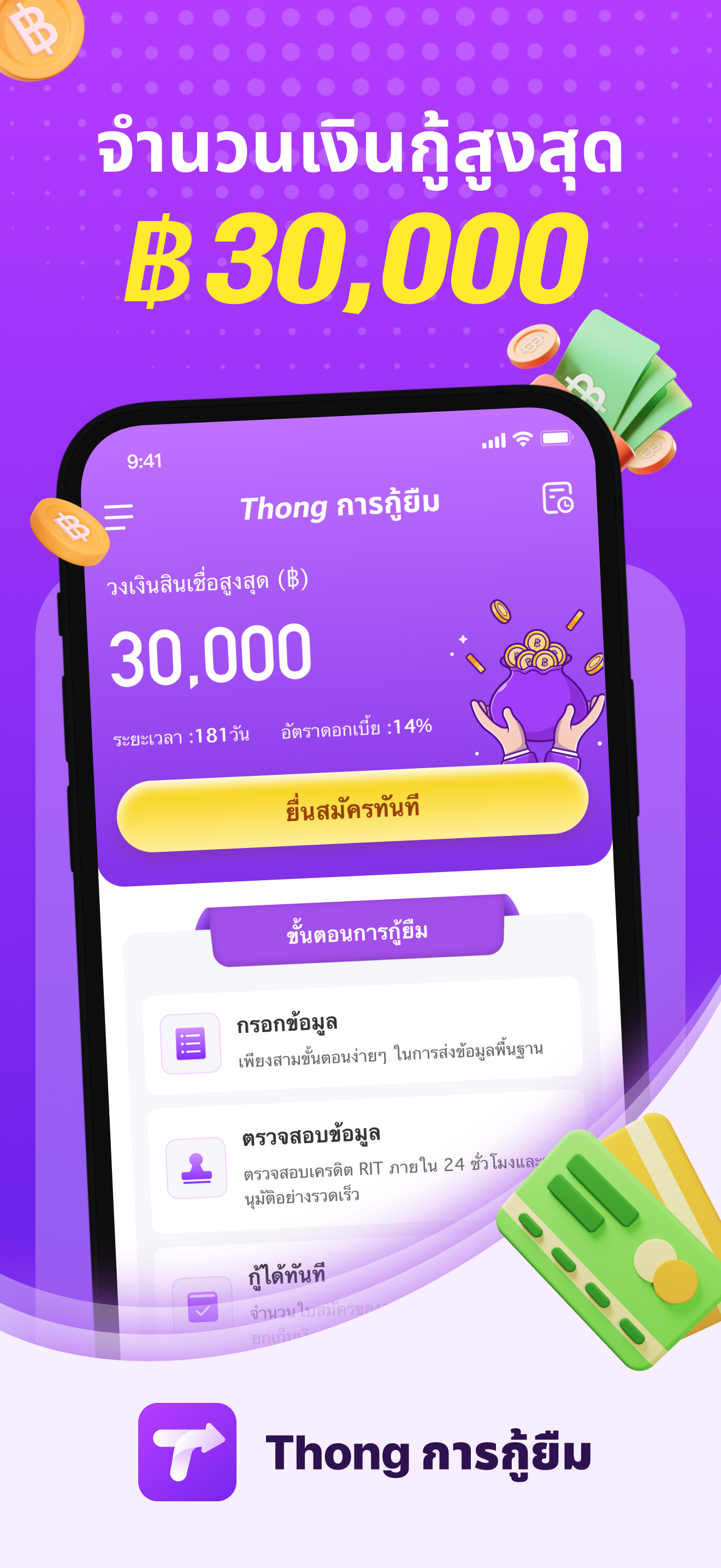 คุณเพียงแค่ดาวน์โหลดและเปิดแอป Thong การกู้ยืม ลงทะเบียนบัญชี กรอกข้อมูลพื้นฐาน อัปโหลดเอกสารที่จำเป็น และส่งใบสมัคร ระบบจะประเมินและแจ้งผลโดยอัตโนมัติในเวลาอันสั้น